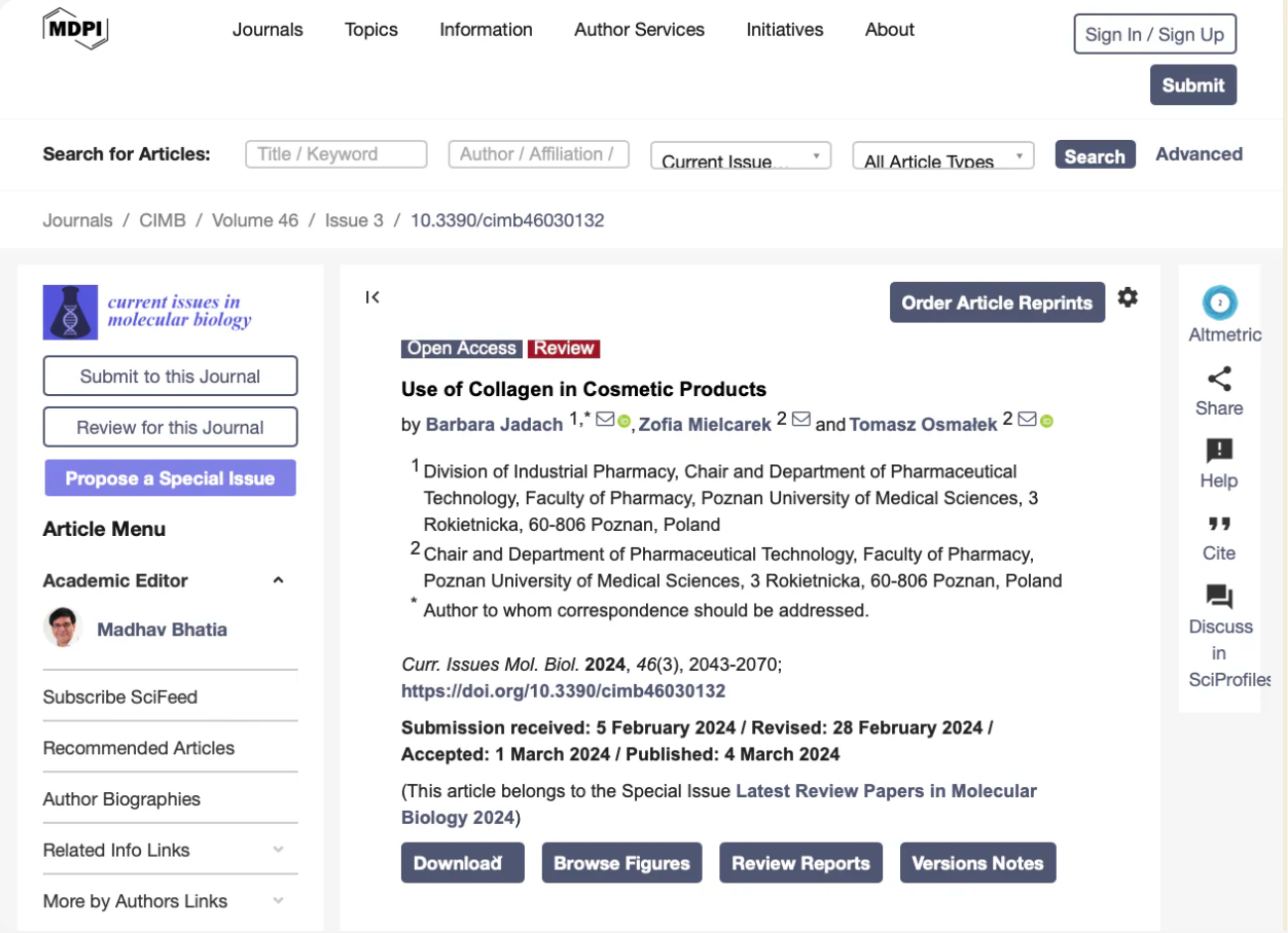 A study published in the MDPI – Journal of Cosmetic Sciences (2024) showed that topical application of bio-collagenimproves skin elasticity, increases hydration, and reduces wrinkle depth.It also helps counteract oxidative stress and glycation, two key processes in skin aging.